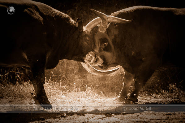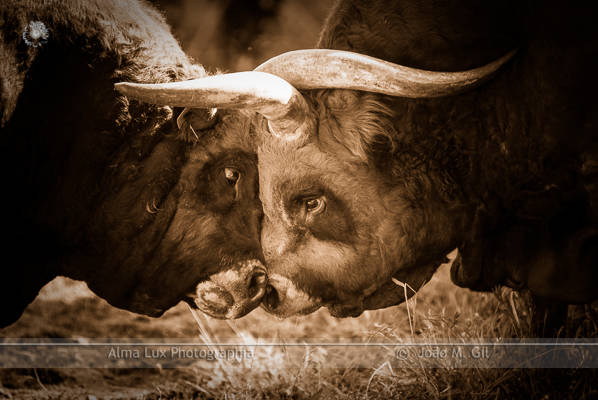 Two big males fight for territory and female mates. It involves no blood or wounds, but it is tremendously powerful and violent. It is in their blood and genes, with or without any interference of Man. It is the first time they meet, but there is an unbeatable power that makes them clash and fight together and against. Their eyes seem expressionless, as if blind. There is something beyond that moves them, attracting them for the expulsion of the other. Horns and weight are their weapons. Winning means survival, for their own best kin. Head-to-head, who will leave?